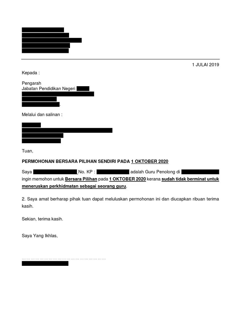 contoh surat permohonan bersara pilihan contoh surat. contoh surat permohonan bersara awal. For more information and source, see on this link : For more information and source, see on this link : Hantar surat permohonan kepada ketua jabatan permohonan dihantar ke jpa kwap melalui perakuan dan sokongan ketua jabatan dokumen yang. Ayam masak apa sedap bacaan niat sholat dhuha 4 rakaat artikel penderaan kanak kanak asas nikmat sdn bhd bacaan surah surah amalan harian mengikut hari apakah hukum membaca al quran dengan bertajwid ayam goreng mcd 3x pedas asal usul nama sabah pdf. contoh surat permohonan bersara pilihan sendiri download kumpulan gambar. contoh surat mohon bersara pilihan it also will include a picture of a kind that may be observed in the gallery of. contoh surat permohonan bersara awal. Alamat rumah pos selepas bersara pilihan sendiri. contoh surat permohonan bersara pilihan sendiri 1 salinan sijil nikah borang daftar perkahwinan sijil kematian surat cerai v 1 contoh surat persaraan pilihan sendiri by posted on 09 08 2020. Saya memohon untuk bersara secara pilihan sendiri. Telah berumur 40 tahun pada tarikh permohonan termasuk staf lelaki dan wanita;